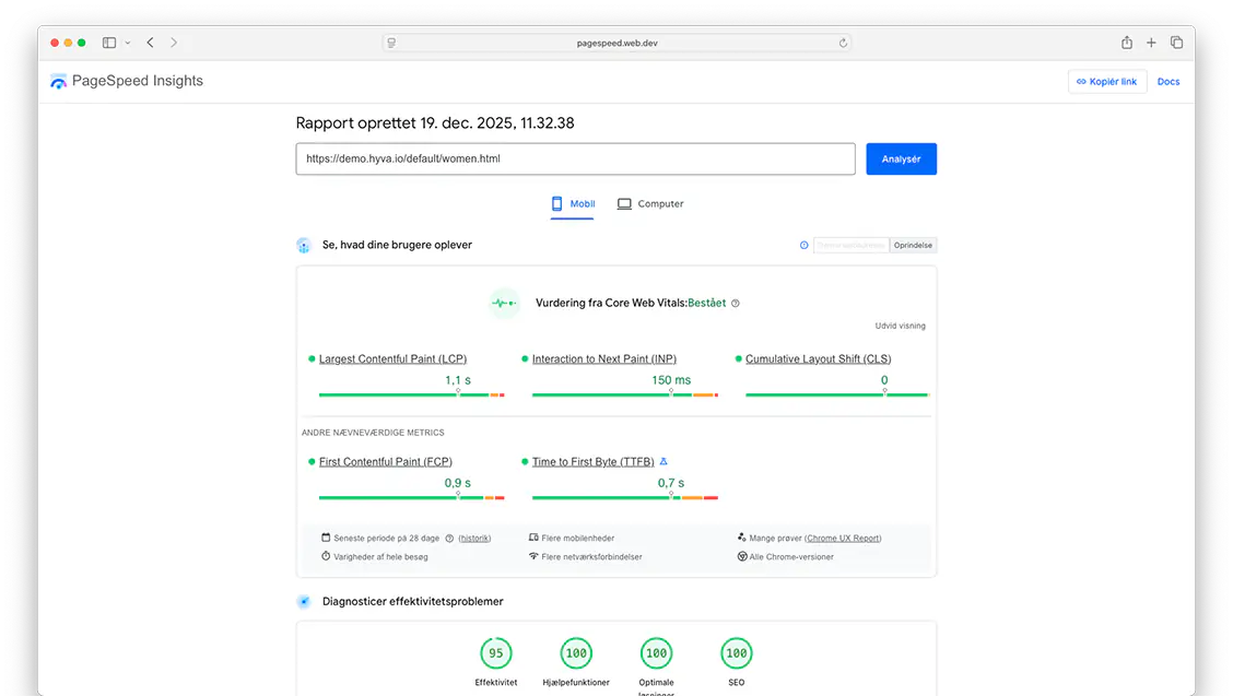 Med Hyvä opnår din Magento 2-shop markant bedre resultater i Lighthouse og Core Web Vitals. Den lette og moderne frontend giver hurtigere indlæsning, mere stabile sider og bedre interaktion – hvilket både øger konverteringer og styrker din placering i Google.